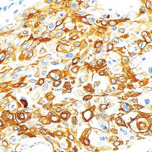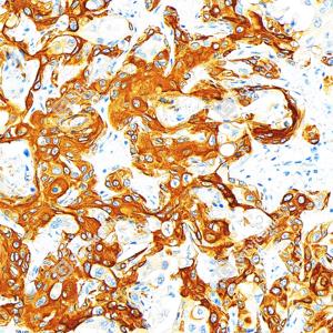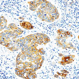 IHC检测Cytokeratin 17蛋白(货号 GB152104). 样品: 人肺鳞状细胞癌, 4%多聚甲醛 (货号G1101) 固定12-24小时. 抗原修复: 柠檬酸抗原修复液(干粉, pH 6.0) (G1201), 高压锅均匀喷气计时2分钟. —抗: 1: 1000稀释, 4℃ 孵育过夜. 二抗: S-vision免疫组化多聚二抗(山羊抗兔),即用型 (货号G1302), 室温孵育20分钟. |