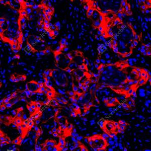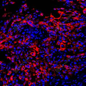 IF检测Cytokeratin 17蛋白(货号 GB152104)(红色). 样品: 人喉鳞状细胞癌, 4%多聚甲醛 (货号G1101) 固定12-24小时. 抗原修复: 柠檬酸抗原修复液(干粉, pH 6.0) (G1201), 高压锅均匀喷气计时2分钟. 封闭: 3% BSA(货号GC305010)的PBS溶液, 室温孵育30分钟. —抗: 1: 1000稀释, 4℃ 孵育过夜. 二抗: Cy3标记山羊抗兔IgG (H+L) (货号GB21303), 1: 300稀释, 室温孵育1小时. |