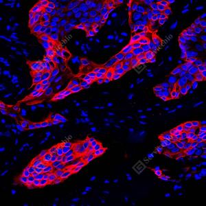IF检测Cytokeratin 17蛋白(货号 GB152104)(红色). 样品: 人肺鳞状细胞癌, 4%多聚甲醛 (货号G1101) 固定12-24小时. 抗原修复: 柠檬酸抗原修复液(干粉, pH 6.0) (G1201), 高压锅均匀喷气计时2分钟. 封闭: 3% BSA(货号GC305010)的PBS溶液, 室温孵育30分钟. —抗: 1: 1000稀释, 4℃ 孵育过夜. 二抗: Cy3标记山羊抗兔IgG (H+L) (货号GB21303), 1: 300稀释, 室温孵育1小时. |