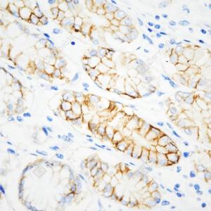 IHC检测Carbonic Anhydrase 9/CA9蛋白(货号 GB151184). 样品: 人胃, 4%多聚甲醛 (货号G1101) 固定12-24小时. 抗原修复: 柠檬酸抗原修复液(干粉, pH 6.0) (G1201), 高压锅均匀喷气计时2分钟. —抗: 1: 500稀释, 4℃ 孵育过夜. 二抗: HRP标记山羊抗小鼠IgG (H+L) (货号GB23301), 1: 200稀释, 室温孵育1小时. |