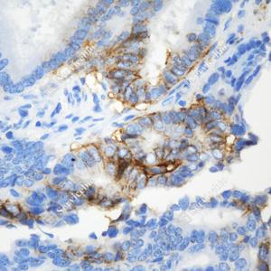 IHC检测Carbonic Anhydrase 9/CA9蛋白(货号 GB151184). 样品: 人结肠癌, 4%多聚甲醛 (货号G1101) 固定12-24小时. 抗原修复: 柠檬酸抗原修复液(干粉, pH 6.0) (G1201), 高压锅均匀喷气计时2分钟. —抗: 1: 500稀释, 4℃ 孵育过夜. 二抗: HRP标记山羊抗小鼠IgG (H+L) (货号GB23301), 1: 200稀释, 室温孵育1小时. |