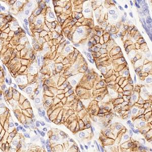 IHC检测Carbonic Anhydrase 9/CA9蛋白(货号 GB121184). 样品: 人胃, 4%多聚甲醛 (货号G1101) 固定12-24小时. 抗原修复: 柠檬酸抗原修复液(干粉, pH 6.0) (G1201), 高压锅均匀喷气计时2分钟. —抗: 1: 1000稀释, 4℃ 孵育过夜. 二抗: HRP标记山羊抗小鼠IgG (H+L) (货号GB23301), 1: 200稀释, 室温孵育1小时. |