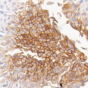 IHC检测Carbonic Anhydrase 9/CA9蛋白(货号 GB121184). 样品: 人肾癌, 4%多聚甲醛 (货号G1101) 固定12-24小时. 抗原修复: 柠檬酸抗原修复液(干粉, pH 6.0) (G1201), 高压锅均匀喷气计时2分钟. —抗: 1: 1000稀释, 4℃ 孵育过夜. 二抗: HRP标记山羊抗小鼠IgG (H+L) (货号GB23301), 1: 200稀释, 室温孵育1小时. |
