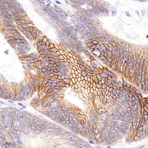 IHC检测Carbonic Anhydrase 9/CA9蛋白(货号 GB121184). 样品: 人结肠癌, 4%多聚甲醛 (货号G1101) 固定12-24小时. 抗原修复: 柠檬酸抗原修复液(干粉, pH 6.0) (G1201), 高压锅均匀喷气计时2分钟. —抗: 1: 1000稀释, 4℃ 孵育过夜. 二抗: HRP标记山羊抗小鼠IgG (H+L) (货号GB23301), 1: 200稀释, 室温孵育1小时. |