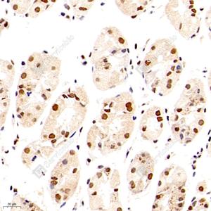 IHC检测p27 KIP 1蛋白(货号 GB11154). 样品: 人胃, 4%多聚甲醛 (货号G1101) 固定12-24小时. 抗原修复: 柠檬酸抗原修复液(干粉, pH 6.0) (G1201), 98℃, 20分钟. —抗: 1: 400稀释, 4℃ 孵育过夜. 二抗: HRP标记山羊抗兔IgG (H+L) (货号GB23303), 1: 200稀释, 室温孵育1小时. |