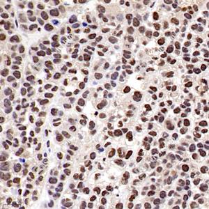 IHC检测p27 KIP 1蛋白(货号 GB11154). 样品: 人皮下移植瘤, 4%多聚甲醛 (货号G1101) 固定12-24小时. 抗原修复: 柠檬酸抗原修复液(干粉, pH 6.0) (G1201), 98℃, 20分钟. —抗: 1: 400稀释, 4℃ 孵育过夜. 二抗: HRP标记山羊抗兔IgG (H+L) (货号GB23303), 1: 200稀释, 室温孵育1小时. |