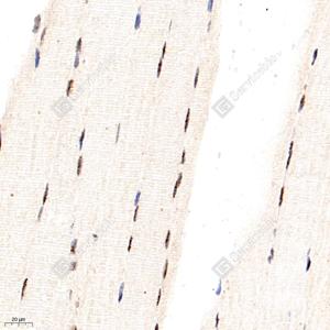 IHC检测p27 KIP 1蛋白(货号 GB11154). 样品: 大鼠骨骼肌, 4%多聚甲醛 (货号G1101) 固定12-24小时. 抗原修复: 柠檬酸抗原修复液(干粉, pH 6.0) (G1201), 98℃, 20分钟. —抗: 1: 500稀释, 4℃ 孵育过夜. 二抗: HRP标记山羊抗兔IgG (H+L) (货号GB23303), 1: 200稀释, 室温孵育1小时. |