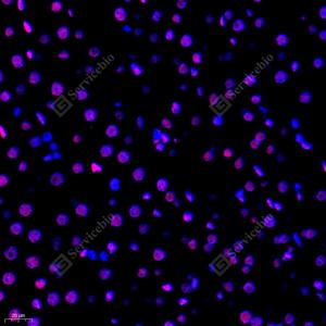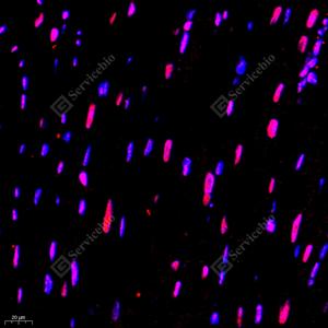 IF检测p27 KIP 1蛋白(货号 GB11154)(红色). 样品: 小鼠心, 4%多聚甲醛 (货号G1101) 固定12-24小时. 抗原修复: Tris-EDTA抗原修复液(pH 9.0) (G1203), 98℃, 20分钟. 封闭: 3% BSA(货号GC305010)的PBS溶液, 室温孵育30分钟. —抗: 1: 400稀释, 4℃ 孵育过夜. 二抗: Cy3标记山羊抗兔IgG (H+L) (货号GB21303), 1: 300稀释, 室温孵育1小时. |