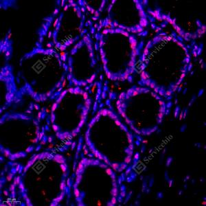 IF检测p27 KIP 1蛋白(货号 GB11154)(红色). 样品: 大鼠结肠, 4%多聚甲醛 (货号G1101) 固定12-24小时. 抗原修复: Tris-EDTA抗原修复液(pH 9.0) (G1203), 98℃, 20分钟. 封闭: 3% BSA(货号GC305010)的PBS溶液, 室温孵育30分钟. —抗: 1: 400稀释, 4℃ 孵育过夜. 二抗: Cy3标记山羊抗兔IgG (H+L) (货号GB21303), 1: 300稀释, 室温孵育1小时. |
