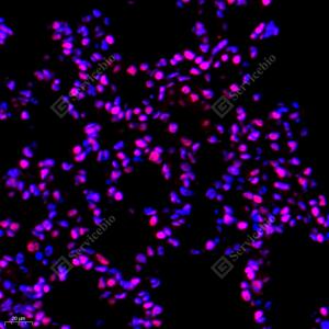 IF检测p27 KIP 1蛋白(货号 GB11154)(红色). 样品: 大鼠肺炎, 4%多聚甲醛 (货号G1101) 固定12-24小时. 抗原修复: Tris-EDTA抗原修复液(pH 9.0) (G1203), 98℃, 20分钟. 封闭: 3% BSA(货号GC305010)的PBS溶液, 室温孵育30分钟. —抗: 1: 400稀释, 4℃ 孵育过夜. 二抗: Cy3标记山羊抗兔IgG (H+L) (货号GB21303), 1: 300稀释, 室温孵育1小时. |