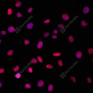 ICC检测p27 KIP 1蛋白(货号 GB11154)(红色). 样品: Hela细胞, 4%多聚甲醛 (货号G1101) 固定20分钟. 封闭: 3% BSA(货号GC305010)的PBS溶液, 室温孵育30分钟. —抗: 1: 200稀释, 4℃ 孵育过夜. 二抗: Cy3标记山羊抗兔IgG (H+L) (货号GB21303), 1: 300稀释, 室温孵育1小时. |