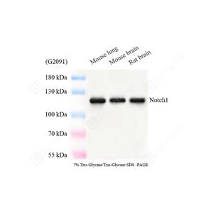 | WB检测Notch1蛋白(货号 GB151690). 样品: 经RIPA裂解液(货号G2002)处理的蛋白质. 封闭: 3%脱脂牛奶(货号GC310001)溶于TBST溶液, 室温孵育1小时. —抗: 1: 500稀释, 4℃ 孵育过夜. 二抗: HRP标记山羊抗兔IgG (H+L) (货号GB23303), 1: 5000稀释, 室温孵育1小时. |