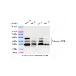 | WB检测Cathepsin L/MEP蛋白(货号 GB155577). 样品: 经RIPA裂解液(货号G2002)处理的蛋白质. 封闭: 3%脱脂牛奶(货号GC310001)溶于TBST溶液, 室温孵育1小时. —抗: 1: 1000稀释, 4℃ 孵育过夜. 二抗: HRP标记山羊抗兔IgG (H+L) (货号GB23303), 1: 5000稀释, 室温孵育1小时. |
