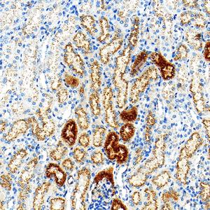 | IHC检测Cathepsin L/MEP蛋白(货号 GB155577). 样品: 小鼠肾, 4%多聚甲醛 (货号G1101) 固定12-24小时. 抗原修复: 抗原修复仪 (货号 ARI-4),Tris-EDTA抗原修复液(pH 9.0) (货号G1203), 水浴100℃, 25分钟. —抗: 1: 1000稀释, 4℃ 孵育过夜. 二抗: S-vision免疫组化多聚二抗(山羊抗兔),即用型 (货号G1302), 室温孵育20分钟. |