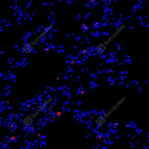 | IF检测Cathepsin L/MEP蛋白(货号 GB155577)(红色). 样品: 小鼠肺, 4%多聚甲醛 (货号G1101) 固定12-24小时. 抗原修复: 抗原修复仪 (货号 ARI-4),Tris-EDTA抗原修复液(pH 9.0) (货号G1203), 水浴90℃, 30分钟. 封闭: 3% BSA(货号GC305010)的PBS溶液, 室温孵育30分钟. —抗: 1: 1000稀释, 4℃ 孵育过夜. 二抗: Cy3标记山羊抗兔IgG (H+L) (货号GB21303), 1: 300稀释, 室温孵育1小时. |