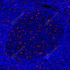 | IF检测Cathepsin L/MEP蛋白(货号 GB155577)(红色). 样品: 人扁桃体, 4%多聚甲醛 (货号G1101) 固定12-24小时. 抗原修复: 抗原修复仪 (货号 ARI-4),Tris-EDTA抗原修复液(pH 9.0) (货号G1203), 水浴90℃, 30分钟. 封闭: 3% BSA(货号GC305010)的PBS溶液, 室温孵育30分钟. —抗: 1: 1000稀释, 4℃ 孵育过夜. 二抗: Cy3标记山羊抗兔IgG (H+L) (货号GB21303), 1: 300稀释, 室温孵育1小时. |