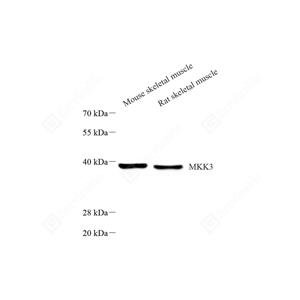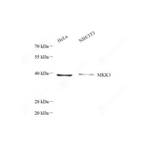 WB检测MEK3蛋白(货号 GB115568). 样品: 经RIPA裂解液(货号G2002)处理的蛋白质. 封闭: 封闭: 3%脱脂牛奶(货号GC310001)溶于TBST溶液, 室温孵育1小时. —抗: 1: 300稀释, 4℃ 孵育过夜. 二抗: HRP标记山羊抗兔IgG (H+L) (货号GB23303), 1: 5000稀释, 室温孵育1小时. |