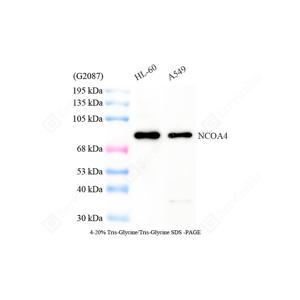 | WB检测NCOA4蛋白(货号 GB150108). 样品: 经RIPA裂解液(货号G2002)处理的蛋白质. 封闭: 3%脱脂牛奶(货号GC310001)溶于TBST溶液, 室温孵育1小时. —抗: 1: 1000稀释, 4℃ 孵育过夜. 二抗: HRP标记山羊抗兔IgG (H+L) (货号GB23303), 1: 5000稀释, 室温孵育1小时. |