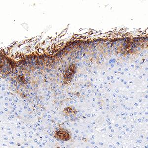 | IHC检测Integrin beta 1/CD29蛋白(货号 GB155629). 样品: 人食管, 4%多聚甲醛 (货号G1101) 固定12-24小时. 抗原修复: Tris-EDTA抗原修复液(pH 9.0) (G1203), 100℃, 25分钟. —抗: 1: 6000稀释, 4℃ 孵育过夜. 二抗: S-vision免疫组化多聚二抗(山羊抗兔),即用型 (货号G1302), 室温孵育20分钟. |