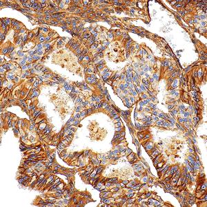 | IHC检测Integrin beta 1/CD29蛋白(货号 GB155629). 样品: 人子宫内膜癌, 4%多聚甲醛 (货号G1101) 固定12-24小时. 抗原修复: Tris-EDTA抗原修复液(pH 9.0) (G1203), 100℃, 25分钟. —抗: 1: 3000稀释, 4℃ 孵育过夜. 二抗: S-vision免疫组化多聚二抗(山羊抗兔),即用型 (货号G1302), 室温孵育20分钟. |