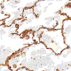 | IHC检测Integrin beta 1/CD29蛋白(货号 GB155629). 样品: 人肺, 4%多聚甲醛 (货号G1101) 固定12-24小时. 抗原修复: Tris-EDTA抗原修复液(pH 9.0) (G1203), 100℃, 25分钟. —抗: 1: 3000稀释, 4℃ 孵育过夜. 二抗: S-vision免疫组化多聚二抗(山羊抗兔),即用型 (货号G1302), 室温孵育20分钟. |