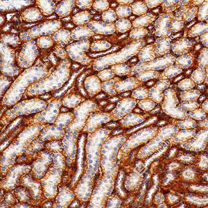 | IHC检测Integrin beta 1/CD29蛋白(货号 GB155629). 样品: 小鼠肾, 4%多聚甲醛 (货号G1101) 固定12-24小时. 抗原修复: Tris-EDTA抗原修复液(pH 9.0) (G1203), 100℃, 25分钟. —抗: 1: 3000稀释, 4℃ 孵育过夜. 二抗: S-vision免疫组化多聚二抗(山羊抗兔),即用型 (货号G1302), 室温孵育20分钟. |