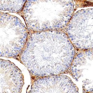 | IHC检测Integrin beta 1/CD29蛋白(货号 GB155629). 样品: 小鼠睾丸, 4%多聚甲醛 (货号G1101) 固定12-24小时. 抗原修复: Tris-EDTA抗原修复液(pH 9.0) (G1203), 100℃, 25分钟. —抗: 1: 3000稀释, 4℃ 孵育过夜. 二抗: S-vision免疫组化多聚二抗(山羊抗兔),即用型 (货号G1302), 室温孵育20分钟. |