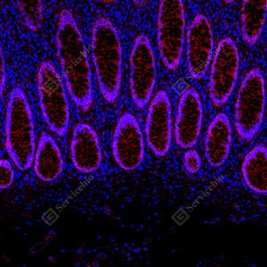 | IF检测Integrin beta 1/CD29蛋白(货号 GB155629)(红色). 样品: 人结肠, 4%多聚甲醛 (货号G1101) 固定12-24小时. 抗原修复: Tris-EDTA抗原修复液(pH 9.0) (G1203), 100℃, 25分钟. 封闭: 3% BSA(货号GC305010)的PBS溶液, 室温孵育30分钟. —抗: 1: 3000稀释, 4℃ 孵育过夜. 二抗: Cy3标记山羊抗兔IgG (H+L) (货号GB21303), 1: 300稀释, 室温孵育1小时. |