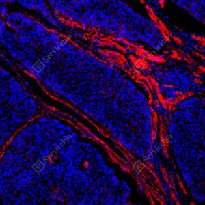 | IF检测Integrin beta 1/CD29蛋白(货号 GB155629)(红色). 样品: 人食管癌, 4%多聚甲醛 (货号G1101) 固定12-24小时. 抗原修复: Tris-EDTA抗原修复液(pH 9.0) (G1203), 100℃, 25分钟. 封闭: 3% BSA(货号GC305010)的PBS溶液, 室温孵育30分钟. —抗: 1: 3000稀释, 4℃ 孵育过夜. 二抗: Cy3标记山羊抗兔IgG (H+L) (货号GB21303), 1: 300稀释, 室温孵育1小时. |