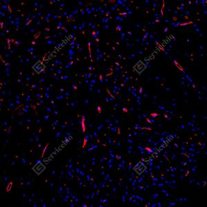 | IF检测Integrin beta 1/CD29蛋白(货号 GB155629)(红色). 样品: 小鼠脊髓, 4%多聚甲醛 (货号G1101) 固定12-24小时. 抗原修复: Tris-EDTA抗原修复液(pH 9.0) (G1203), 100℃, 25分钟. 封闭: 3% BSA(货号GC305010)的PBS溶液, 室温孵育30分钟. —抗: 1: 3000稀释, 4℃ 孵育过夜. 二抗: Cy3标记山羊抗兔IgG (H+L) (货号GB21303), 1: 300稀释, 室温孵育1小时. |