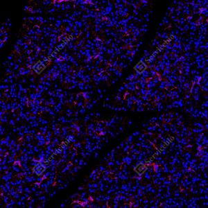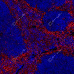 | IF检测Integrin beta 1/CD29蛋白(货号 GB155629)(红色). 样品: 小鼠脾, 4%多聚甲醛 (货号G1101) 固定12-24小时. 抗原修复: Tris-EDTA抗原修复液(pH 9.0) (G1203), 100℃, 25分钟. 封闭: 3% BSA(货号GC305010)的PBS溶液, 室温孵育30分钟. —抗: 1: 3000稀释, 4℃ 孵育过夜. 二抗: Cy3标记山羊抗兔IgG (H+L) (货号GB21303), 1: 300稀释, 室温孵育1小时. |