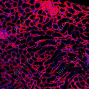 | IF检测Integrin beta 1/CD29蛋白(货号 GB155629)(红色). 样品: 大鼠肾, 4%多聚甲醛 (货号G1101) 固定12-24小时. 抗原修复: Tris-EDTA抗原修复液(pH 9.0) (G1203), 100℃, 25分钟. 封闭: 3% BSA(货号GC305010)的PBS溶液, 室温孵育30分钟. —抗: 1: 3000稀释, 4℃ 孵育过夜. 二抗: Cy3标记山羊抗兔IgG (H+L) (货号GB21303), 1: 300稀释, 室温孵育1小时. |