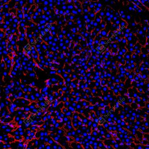| IF检测Integrin beta 1/CD29蛋白(货号 GB155629)(红色). 样品: 大鼠肝, 4%多聚甲醛 (货号G1101) 固定12-24小时. 抗原修复: Tris-EDTA抗原修复液(pH 9.0) (G1203), 100℃, 25分钟. 封闭: 3% BSA(货号GC305010)的PBS溶液, 室温孵育30分钟. —抗: 1: 3000稀释, 4℃ 孵育过夜. 二抗: Cy3标记山羊抗兔IgG (H+L) (货号GB21303), 1: 300稀释, 室温孵育1小时. |