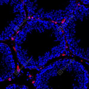 | IF检测Integrin beta 1/CD29蛋白(货号 GB155629)(红色). 样品: 大鼠睾丸, 4%多聚甲醛 (货号G1101) 固定12-24小时. 抗原修复: Tris-EDTA抗原修复液(pH 9.0) (G1203), 100℃, 25分钟. 封闭: 3% BSA(货号GC305010)的PBS溶液, 室温孵育30分钟. —抗: 1: 3000稀释, 4℃ 孵育过夜. 二抗: Cy3标记山羊抗兔IgG (H+L) (货号GB21303), 1: 300稀释, 室温孵育1小时. |