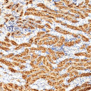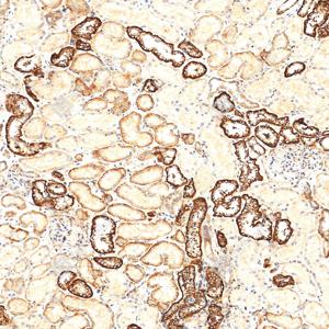 | IHC检测LRP1蛋白(货号 GB155473). 样品: 人肾, 4%多聚甲醛 (货号G1101) 固定12-24小时. 抗原修复: 抗原修复仪(货号 ARI-4),Tris-EDTA抗原修复液(pH 9.0) (货号G1203), 水浴100℃, 25分钟. —抗: 1: 2000稀释, 4℃ 孵育过夜. 二抗: S-vision免疫组化多聚二抗(山羊抗兔),即用型 (货号G1302), 室温孵育20分钟. |