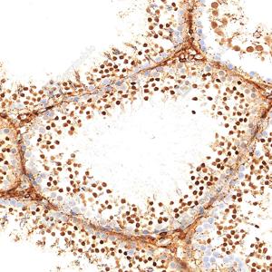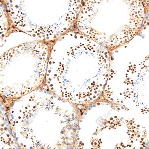 | IHC检测LRP1蛋白(货号 GB155473). 样品: 大鼠睾丸, 4%多聚甲醛 (货号G1101) 固定12-24小时. 抗原修复: 抗原修复仪(货号 ARI-4),Tris-EDTA抗原修复液(pH 9.0) (货号G1203), 水浴100℃, 25分钟. —抗: 1: 2000稀释, 4℃ 孵育过夜. 二抗: S-vision免疫组化多聚二抗(山羊抗兔),即用型 (货号G1302), 室温孵育20分钟. |