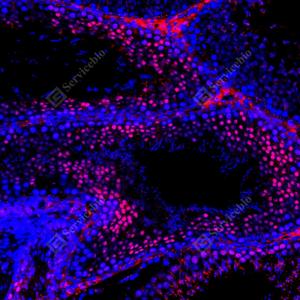 | IF检测LRP1蛋白(货号 GB155473)(红色). 样品: 大鼠睾丸, 4%多聚甲醛 (货号G1101) 固定12-24小时. 抗原修复: 抗原修复仪(货号 ARI-4),Tris-EDTA抗原修复液(pH 9.0) (货号G1203), 水浴100℃, 25分钟. 封闭: 3% BSA(货号GC305010)的PBS溶液, 室温孵育30分钟. —抗: 1: 2000稀释, 4℃ 孵育过夜. 二抗: Cy3标记山羊抗兔IgG (H+L) (货号GB21303), 1: 300稀释, 室温孵育1小时. |