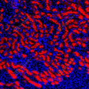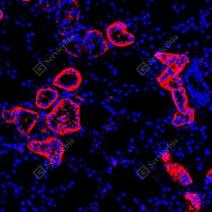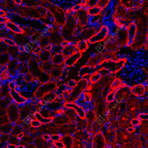 | IF检测LRP1蛋白(货号 GB155473)(红色). 样品: 人肾, 4%多聚甲醛 (货号G1101) 固定12-24小时. 抗原修复: 抗原修复仪(货号 ARI-4),Tris-EDTA抗原修复液(pH 9.0) (货号G1203), 水浴100℃, 25分钟. 封闭: 3% BSA(货号GC305010)的PBS溶液, 室温孵育30分钟. —抗: 1: 4000稀释, 4℃ 孵育过夜. 二抗: Cy3标记山羊抗兔IgG (H+L) (货号GB21303), 1: 300稀释, 室温孵育1小时. |