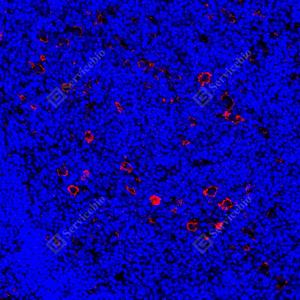 | IF检测LRP1蛋白(货号 GB155473)(红色). 样品: 人扁桃体, 4%多聚甲醛 (货号G1101) 固定12-24小时. 抗原修复: 抗原修复仪(货号 ARI-4),Tris-EDTA抗原修复液(pH 9.0) (货号G1203), 水浴100℃, 25分钟. 封闭: 3% BSA(货号GC305010)的PBS溶液, 室温孵育30分钟. —抗: 1: 4000稀释, 4℃ 孵育过夜. 二抗: Cy3标记山羊抗兔IgG (H+L) (货号GB21303), 1: 300稀释, 室温孵育1小时. |