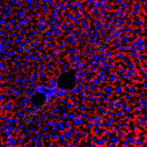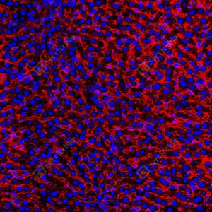 | IF检测LRP1蛋白(货号 GB155473)(红色). 样品: 大鼠肝, 4%多聚甲醛 (货号G1101) 固定12-24小时. 抗原修复: 抗原修复仪(货号 ARI-4),Tris-EDTA抗原修复液(pH 9.0) (货号G1203), 水浴100℃, 25分钟. 封闭: 3% BSA(货号GC305010)的PBS溶液, 室温孵育30分钟. —抗: 1: 4000稀释, 4℃ 孵育过夜. 二抗: Cy3标记山羊抗兔IgG (H+L) (货号GB21303), 1: 300稀释, 室温孵育1小时. |