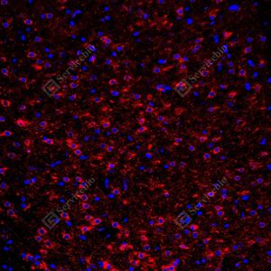 | IF检测LRP1蛋白(货号 GB155473)(红色). 样品: 大鼠脑, 4%多聚甲醛 (货号G1101) 固定12-24小时. 抗原修复: 抗原修复仪(货号 ARI-4),Tris-EDTA抗原修复液(pH 9.0) (货号G1203), 水浴100℃, 25分钟. 封闭: 3% BSA(货号GC305010)的PBS溶液, 室温孵育30分钟. —抗: 1: 4000稀释, 4℃ 孵育过夜. 二抗: Cy3标记山羊抗兔IgG (H+L) (货号GB21303), 1: 300稀释, 室温孵育1小时. |