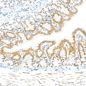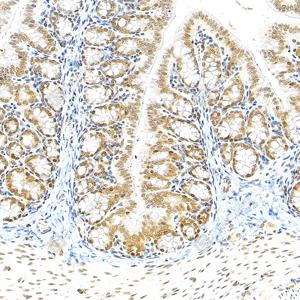 | IHC检测NCOA4蛋白(货号 GB150100). 样品: 小鼠结肠, 4%多聚甲醛 (货号G1101) 固定12-24小时. 抗原修复: Tris-EDTA抗原修复液(pH 9.0) (G1203), 100℃, 25分钟. —抗: 1: 500稀释, 4℃ 孵育过夜. 二抗: S-vision免疫组化多聚二抗(山羊抗兔),即用型 (货号G1302), 室温孵育20分钟. |