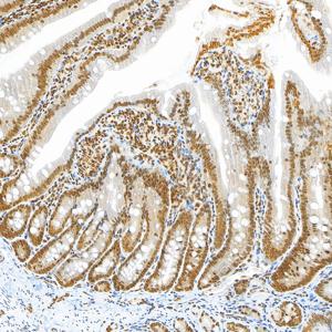 | IHC检测NCOA4蛋白(货号 GB150100). 样品: 大鼠小肠, 4%多聚甲醛 (货号G1101) 固定12-24小时. 抗原修复: Tris-EDTA抗原修复液(pH 9.0) (G1203), 100℃, 25分钟. —抗: 1: 500稀释, 4℃ 孵育过夜. 二抗: S-vision免疫组化多聚二抗(山羊抗兔),即用型 (货号G1302), 室温孵育20分钟. |