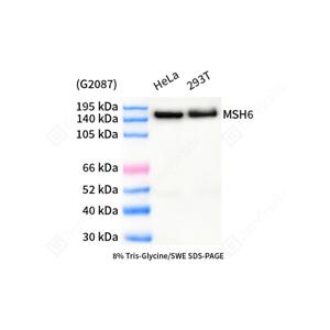 | WB检测MSH6蛋白(货号 GB150196). 样品: 经RIPA裂解液(货号G2002)处理的蛋白质. 封闭: 3%脱脂牛奶(货号GC310001)溶于TBST溶液, 室温孵育1小时. —抗: 1: 1000稀释, 4℃ 孵育过夜. 二抗: HRP标记山羊抗兔IgG (H+L) (货号GB23303), 1: 5000稀释, 室温孵育1小时. |