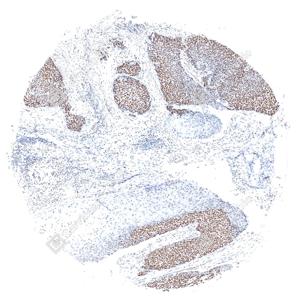 | IHC检测MSH6蛋白(货号 GB150196). 样品: 人食管癌, 4%多聚甲醛 (货号G1101) 固定12-24小时. 抗原修复: 抗原修复仪(货号 ARI-4),Tris-EDTA抗原修复液(pH 9.0) (货号G1203), 水浴100℃, 25分钟. —抗: 1: 2000稀释, 4℃ 孵育过夜. 二抗: S-vision免疫组化多聚二抗(山羊抗兔),即用型 (货号G1302), 室温孵育20分钟. |