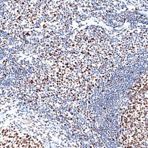 | IHC检测MSH6蛋白(货号 GB150196). 样品: 人扁桃体, 4%多聚甲醛 (货号G1101) 固定12-24小时. 抗原修复: 抗原修复仪(货号 ARI-4),Tris-EDTA抗原修复液(pH 9.0) (货号G1203), 水浴100℃, 25分钟. —抗: 1: 2000稀释, 4℃ 孵育过夜. 二抗: S-vision免疫组化多聚二抗(山羊抗兔),即用型 (货号G1302), 室温孵育20分钟. |