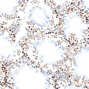 | IHC检测MSH6蛋白(货号 GB150196). 样品: 大鼠睾丸, 4%多聚甲醛 (货号G1101) 固定12-24小时. 抗原修复: 抗原修复仪(货号 ARI-4),Tris-EDTA抗原修复液(pH 9.0) (货号G1203), 水浴100℃, 25分钟. —抗: 1: 2000稀释, 4℃ 孵育过夜. 二抗: S-vision免疫组化多聚二抗(山羊抗兔),即用型 (货号G1302), 室温孵育20分钟. |