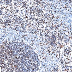 | IHC检测MSH6蛋白(货号 GB150196). 样品: 大鼠脾, 4%多聚甲醛 (货号G1101) 固定12-24小时. 抗原修复: 抗原修复仪(货号 ARI-4),Tris-EDTA抗原修复液(pH 9.0) (货号G1203), 水浴100℃, 25分钟. —抗: 1: 2000稀释, 4℃ 孵育过夜. 二抗: S-vision免疫组化多聚二抗(山羊抗兔),即用型 (货号G1302), 室温孵育20分钟. |