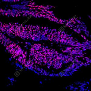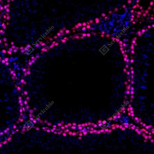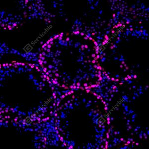 | IF检测MSH6蛋白(货号 GB150196)(红色). 样品: 大鼠睾丸, 4%多聚甲醛 (货号G1101) 固定12-24小时. 抗原修复: 抗原修复仪(货号 ARI-4),Tris-EDTA抗原修复液(pH 9.0) (货号G1203), 水浴100℃, 25分钟. 封闭: 3% BSA(货号GC305010)的PBS溶液, 室温孵育30分钟. —抗: 1: 2000稀释, 4℃ 孵育过夜. 二抗: Cy3标记山羊抗兔IgG (H+L) (货号GB21303), 1: 300稀释, 室温孵育1小时. |