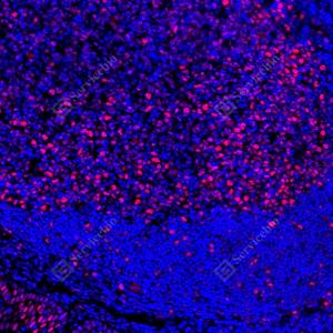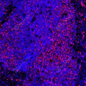 | IF检测MSH6蛋白(货号 GB150196)(红色). 样品: 小鼠脾, 4%多聚甲醛 (货号G1101) 固定12-24小时. 抗原修复: 抗原修复仪(货号 ARI-4),Tris-EDTA抗原修复液(pH 9.0) (货号G1203), 水浴100℃, 25分钟. 封闭: 3% BSA(货号GC305010)的PBS溶液, 室温孵育30分钟. —抗: 1: 2000稀释, 4℃ 孵育过夜. 二抗: Cy3标记山羊抗兔IgG (H+L) (货号GB21303), 1: 300稀释, 室温孵育1小时. |